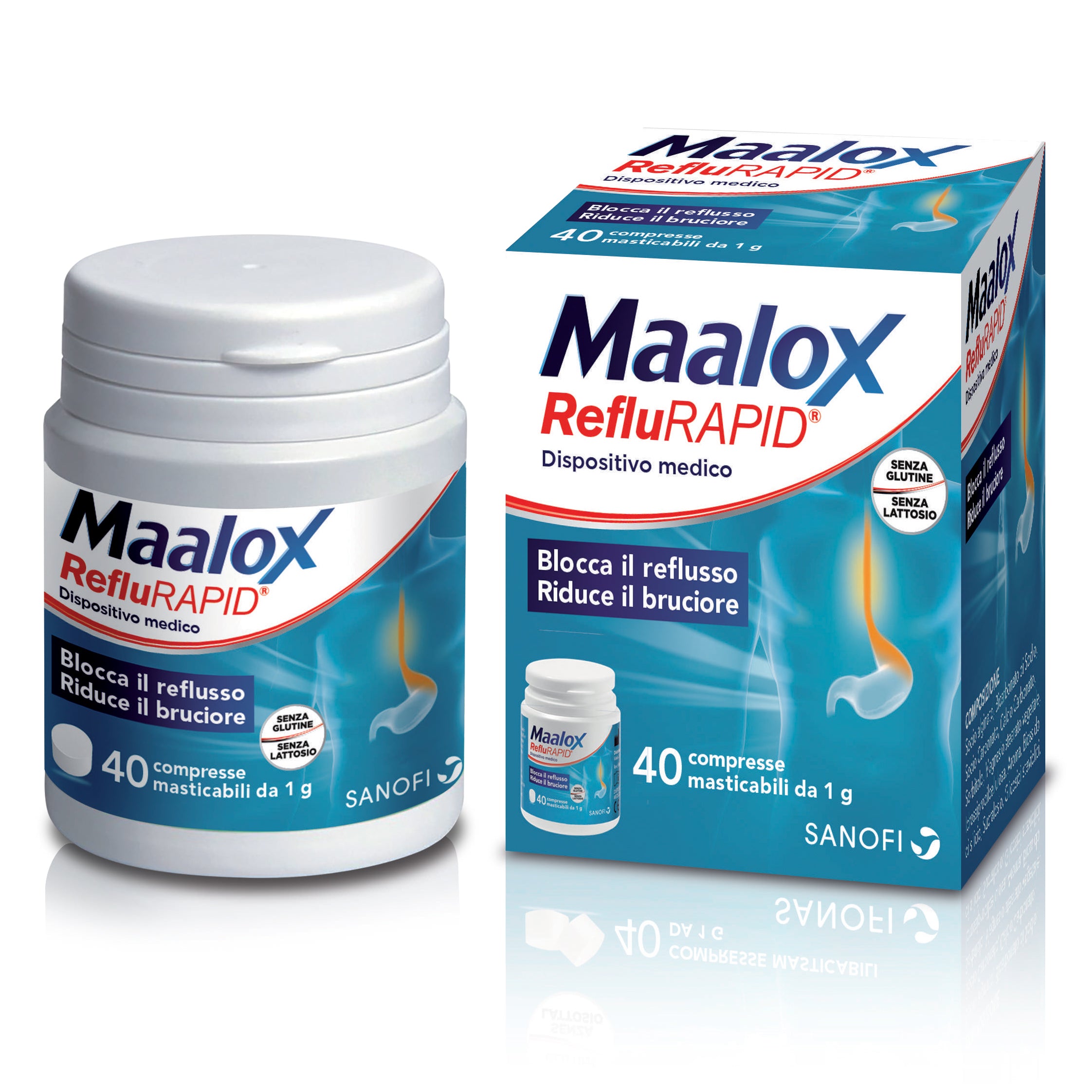 MaaloxRefluRAPIDProdotto ad azione meccanica a base di SodioAlginato, bicarbonato di sodio, sodio carbonato e calcio carbonato, formulato persvolgere 3 azioni...