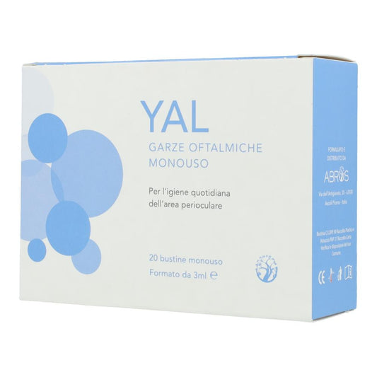 YAL GARZE OFTALMICHE MONOUSO Per l'igiene quitidiana dell'area perioculare. Formato 20 bustine monodose - 3 ml. Cod. 412