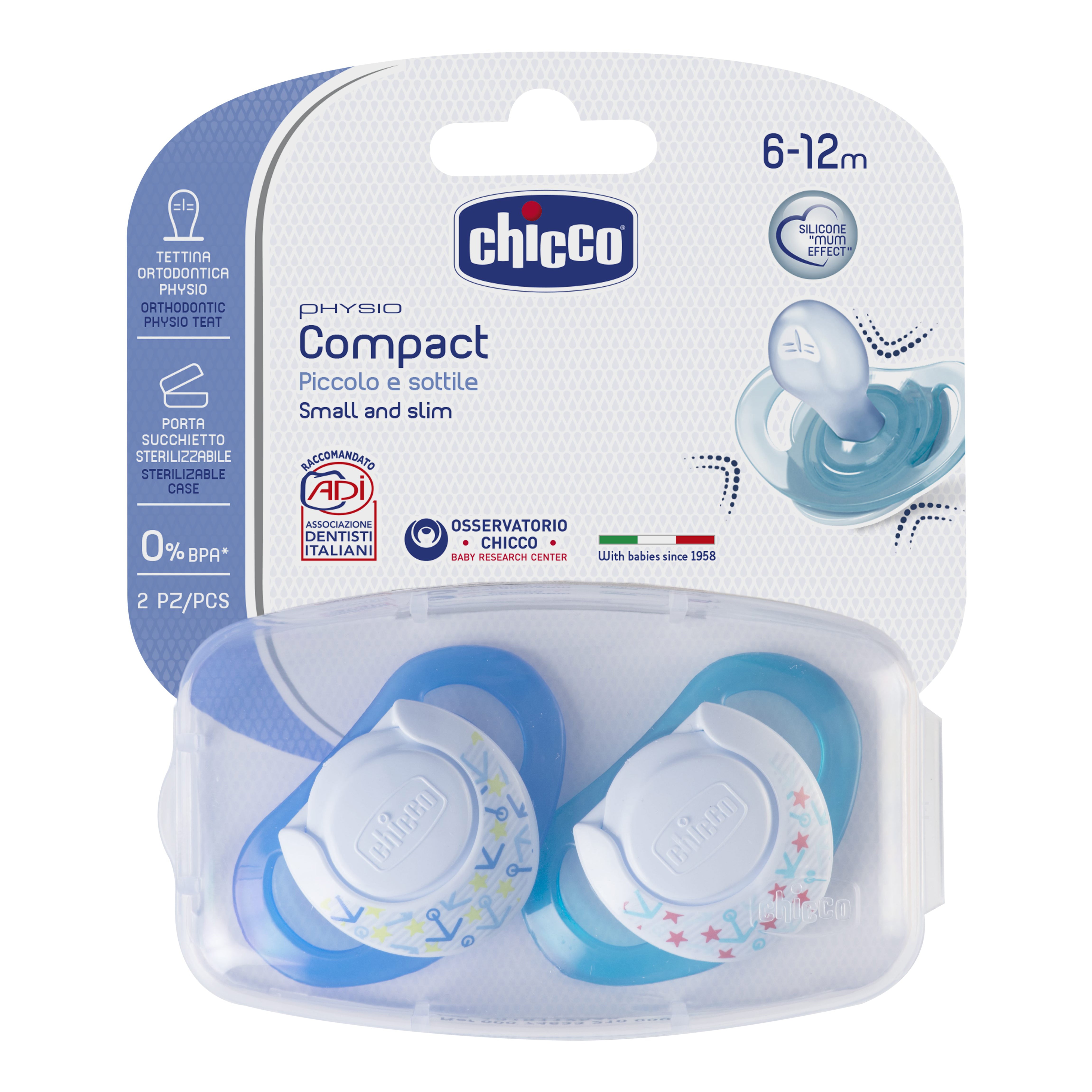chicco physio Compact 6-12m Prodotto dal design ergonomico, pensato per adattarsi delicatamente alla bocca del bambino: • anello di sicurezza...