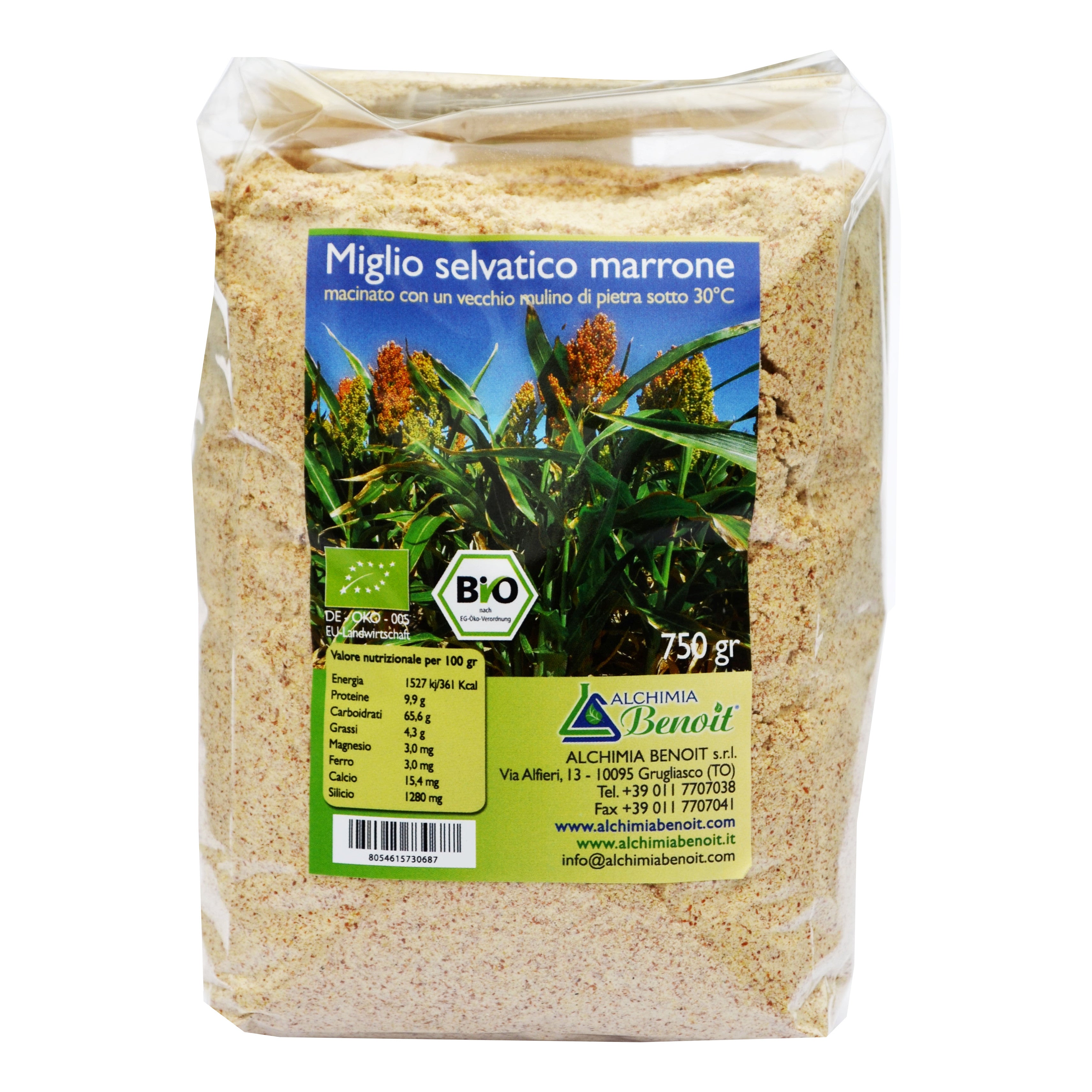 Miglio selvatico marrone macinato con un vecchio mulino di pietra sotto 30°C Alimento privo di glutine e, quindi, di proteine...