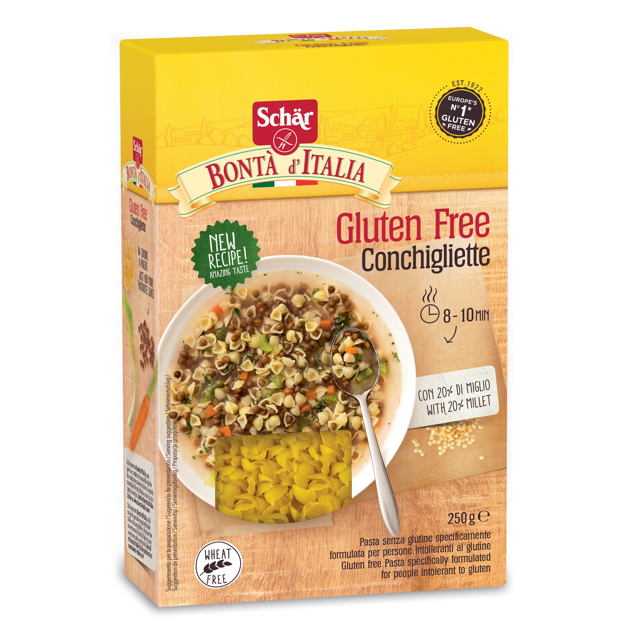 Schär I Classici CONCHIGLIETTE Pasta dietetica senza glutine. Ingredienti Farina di mais; farina di riso; isolato proteico di pisello; emulsionante:...