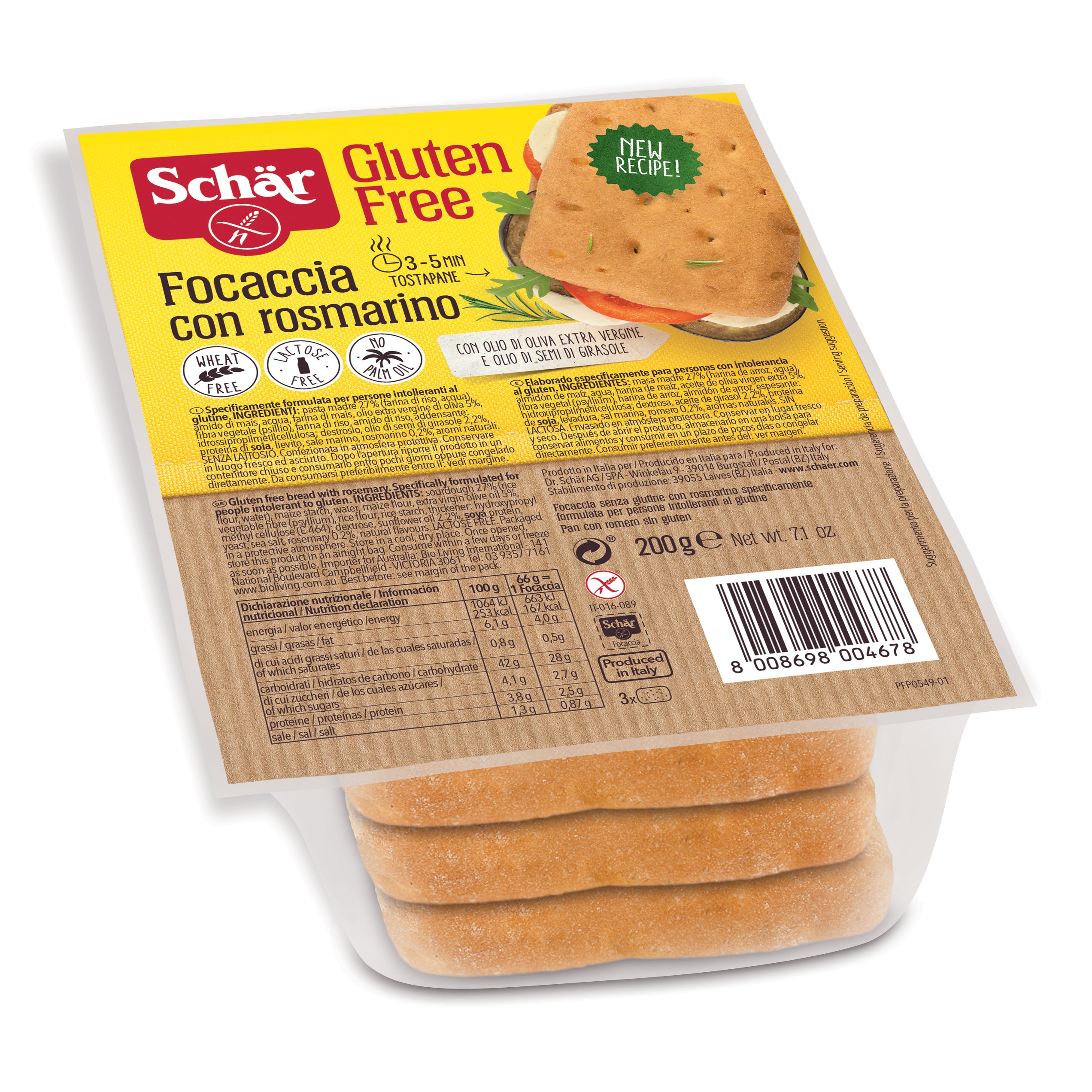 Schär Focaccia Focaccia dietetica senza glutine con rosmarino. Ingredienti Acqua; amido di mais; farina di riso; farina di mais; fibra...