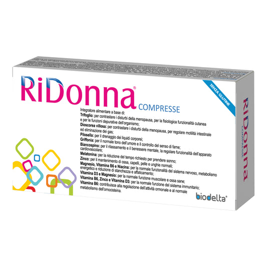 RiDonna Plus Descrizione Integratore alimentare di estratti vegtali standardizzati, calcio, magnesio, zinco, vitamina B12, vitamina D3 e vitamina B6. Trifoglio...