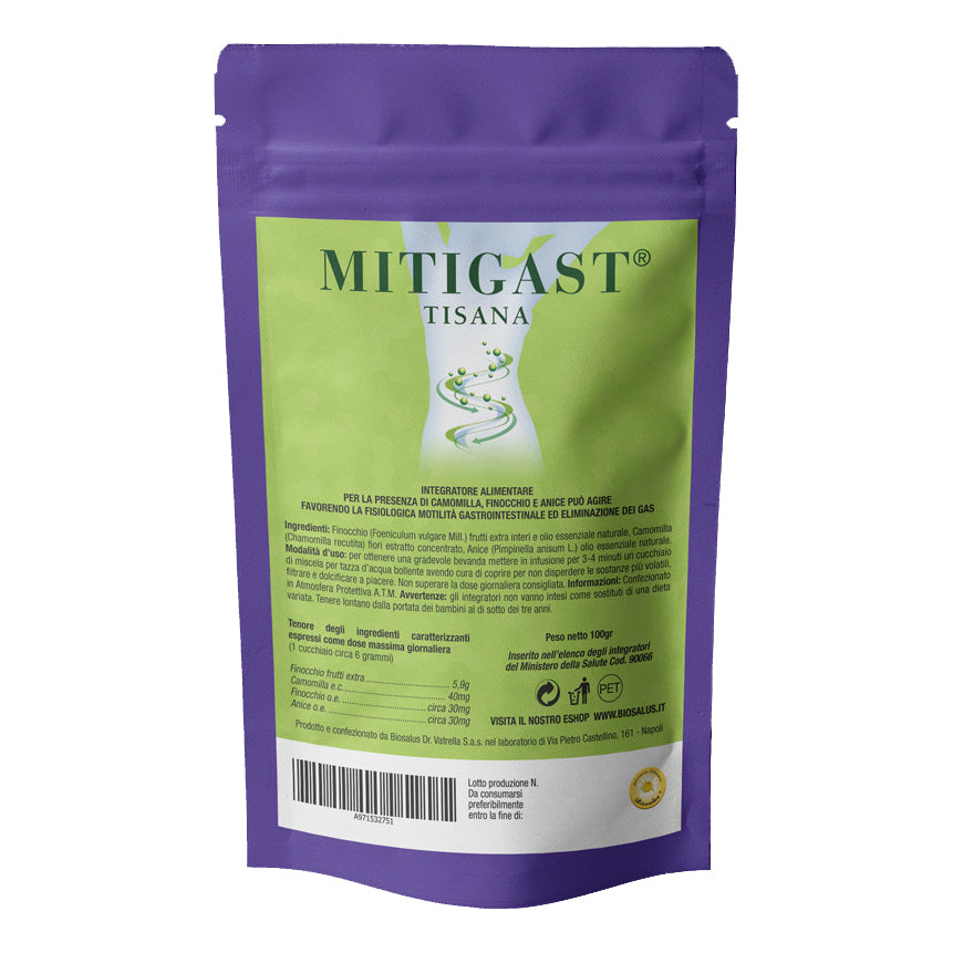 MITIGAST TISANA DescrizioneMiscela alimentare di erbe. Per la presenza di Camomilla, Finocchio e Anice può agire favorendo la fisiologica motilità...