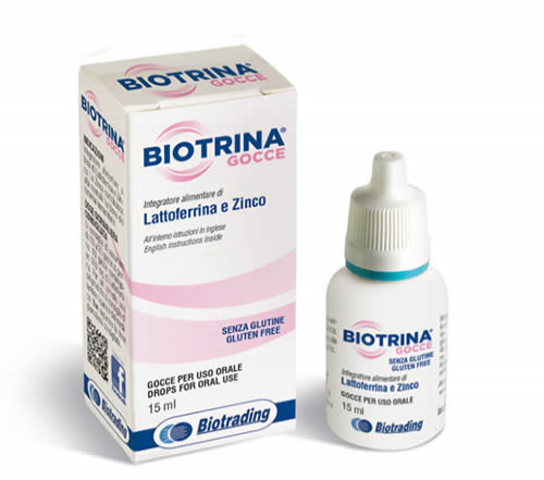 BIOTRINA GOCCE Descrizione Integratore alimentare di lattoferrina, vitamina B6, B12. Senza glutine. Modalità d'uso Si consiglia di assumere 1 ml...