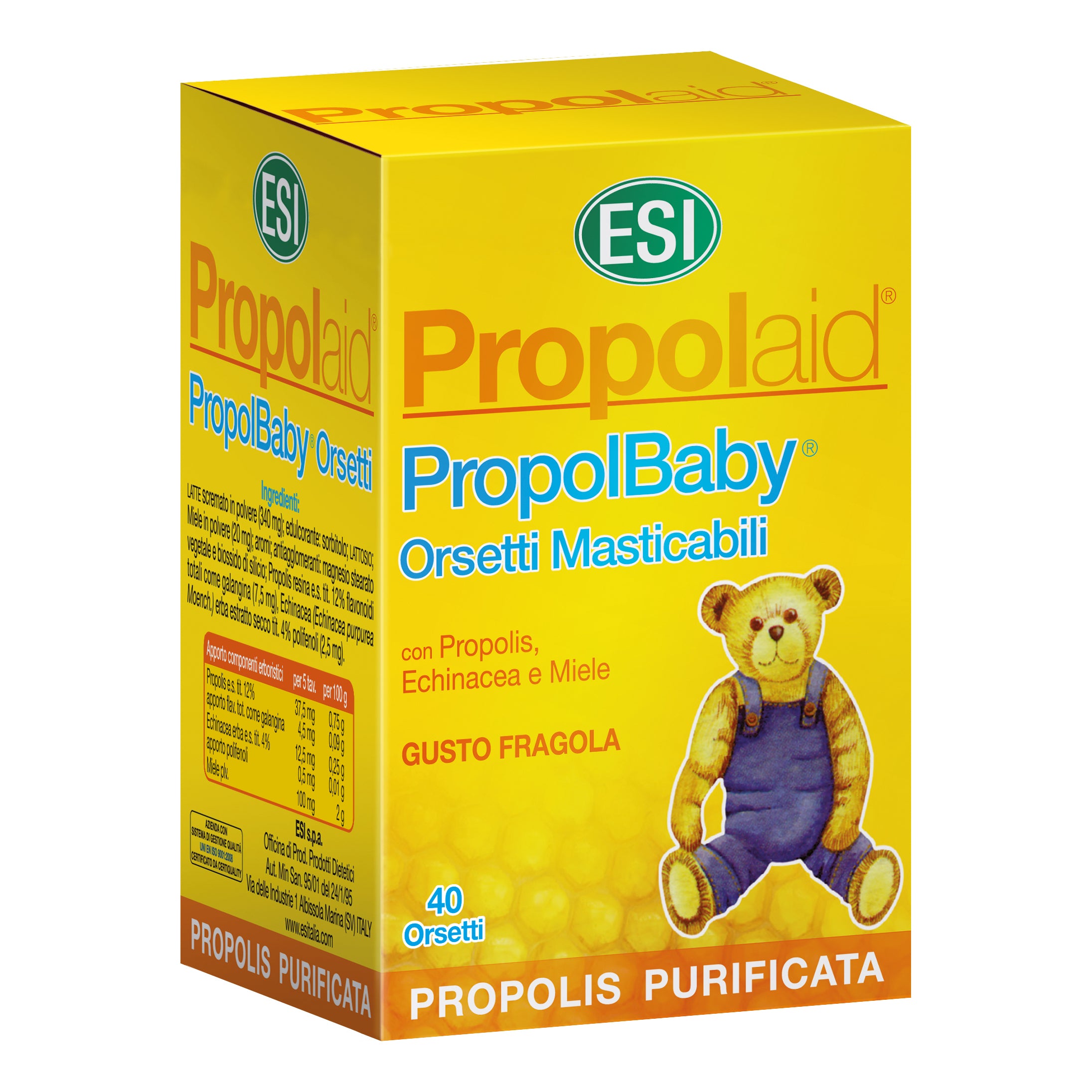 Propolaid PropolBaby Orsetti Masticabili Descrizione Integratore alimentare in tavolette masticabili a forma di orsetto aromatizzate alla fragola. Formulate per renderle...