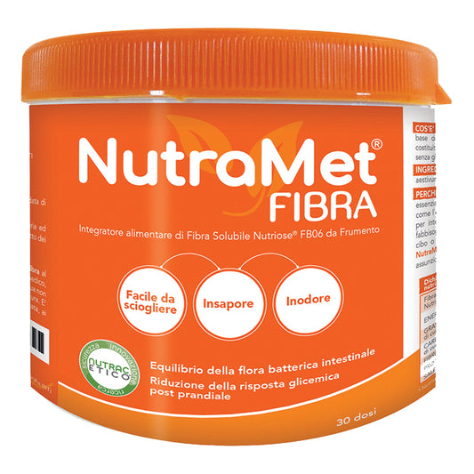 NutraMet FIBRA Descrizione Integratore alimentare a base di fibra completamente solubile e insapore, costituita da destrine resistenti (carboidrati non digeribili)...