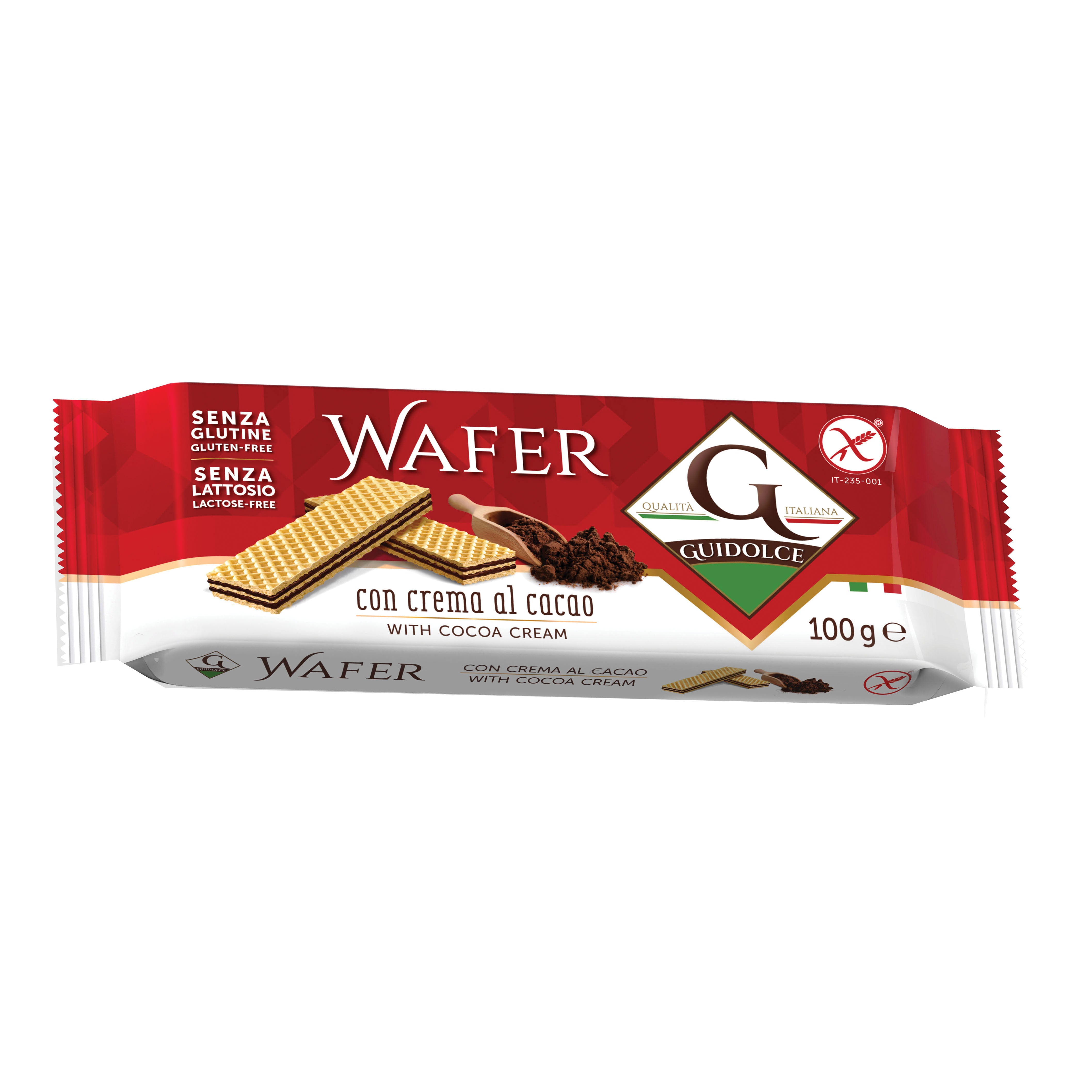 Wafer con crema alla nocciola Descrizione Wafers farciti con crema alla nocciola (crema 75%) senza glutine. 3 cialde di wafer...