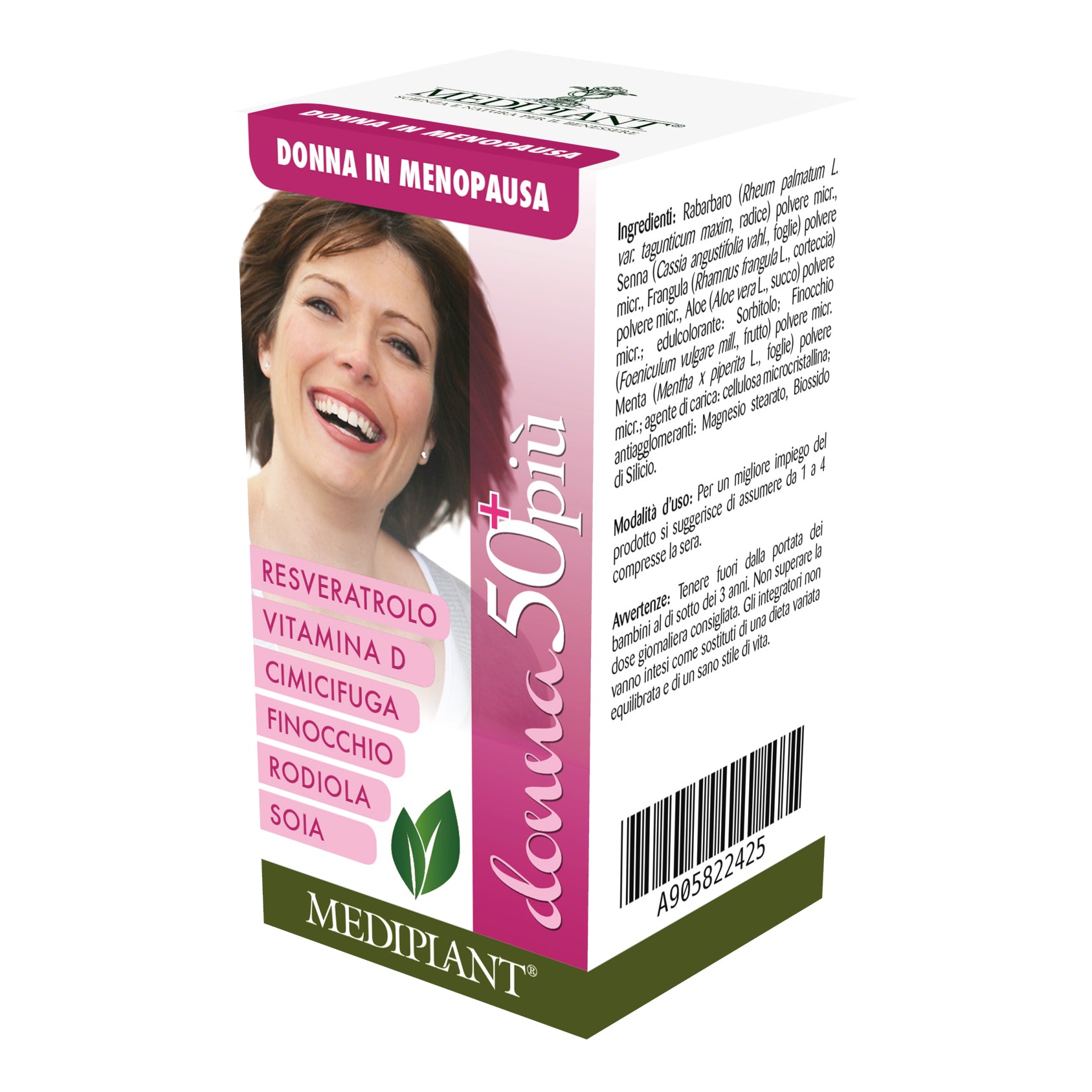 donna 50+più Integratore alimentare utile per il benessere della donna in menopausa. Ingredienti Calcio fosfato bibasico; cimicifuga (cimicifuga racemosa nutt....