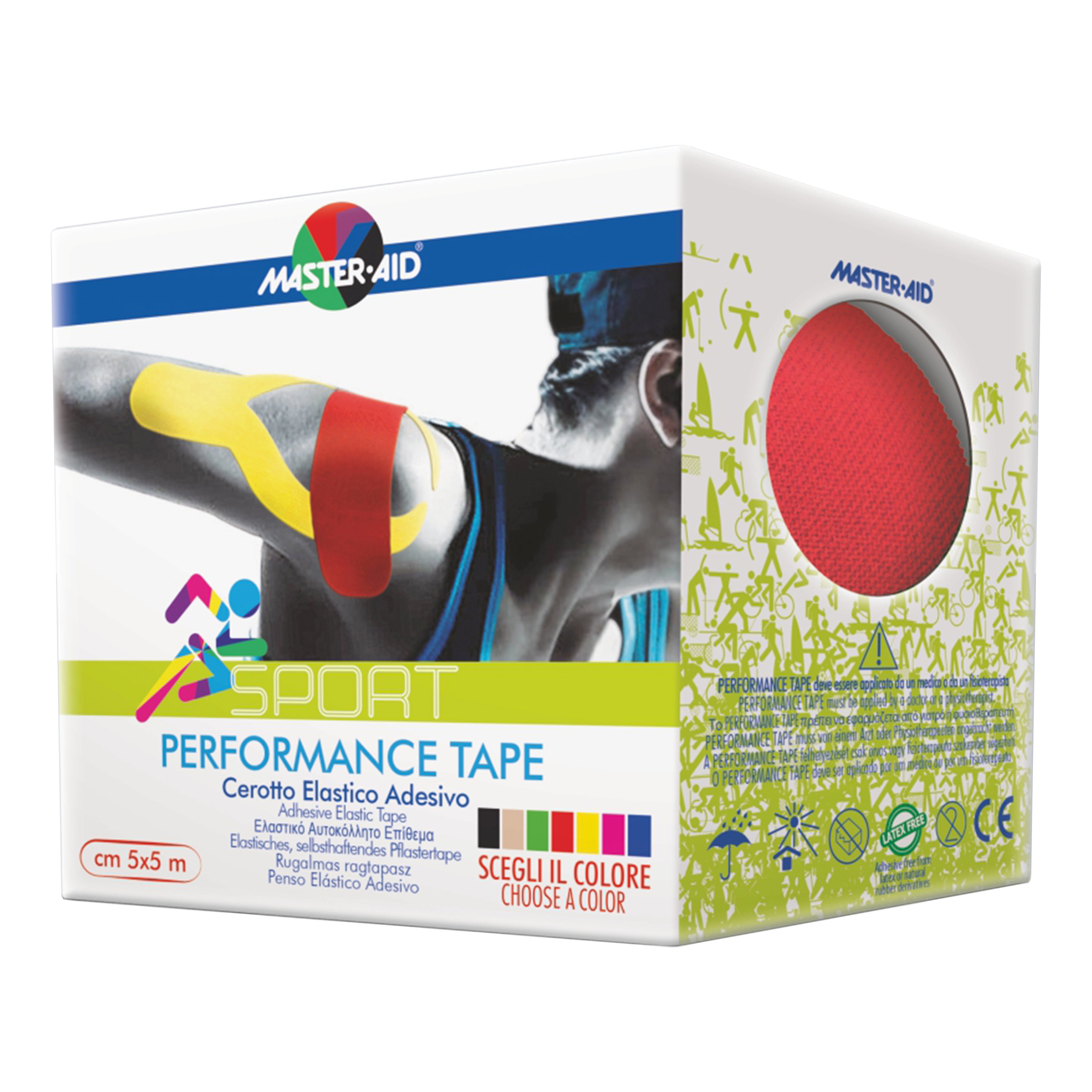Master aid Performance tape Descrizione Cerotto elastico adesivo monoelastico, traspirante e resistente. Coadiuvante nel trattamento fisioterapico di un'ampia varietà di...