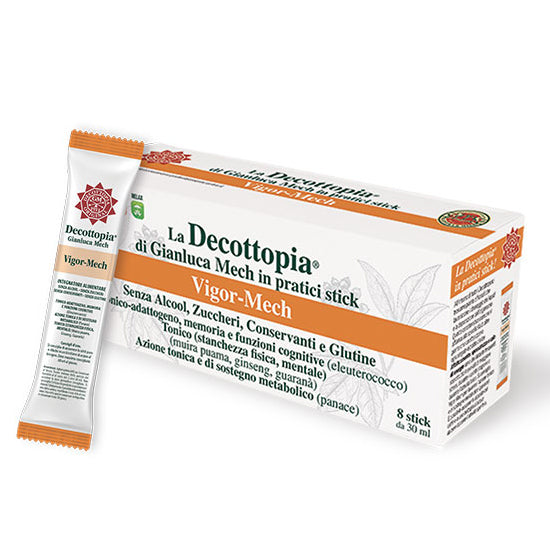 La Decottopia Vigor-Mech Integratore alimentare senza alcool, zuccheri, conservanti e glutine. Ingredienti Eleuterococco, panace, muira puama, ginseng, guaranà, damiana, rosmarino,...