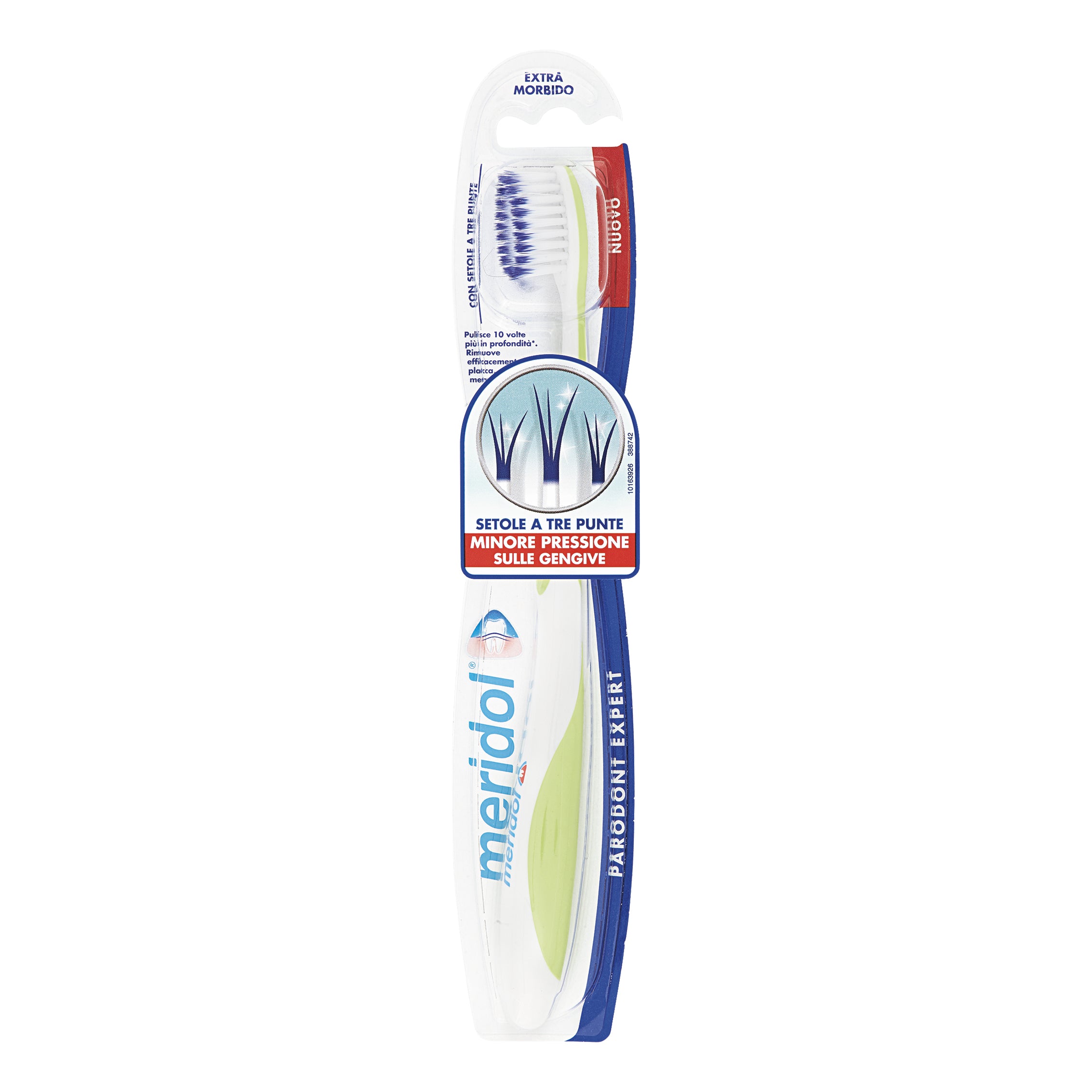 meridolPARODONT EXPERTIl prodotto combina le setole dalle estremità coniche e supersottili con le setole a tre punte. Rimuove la placca...