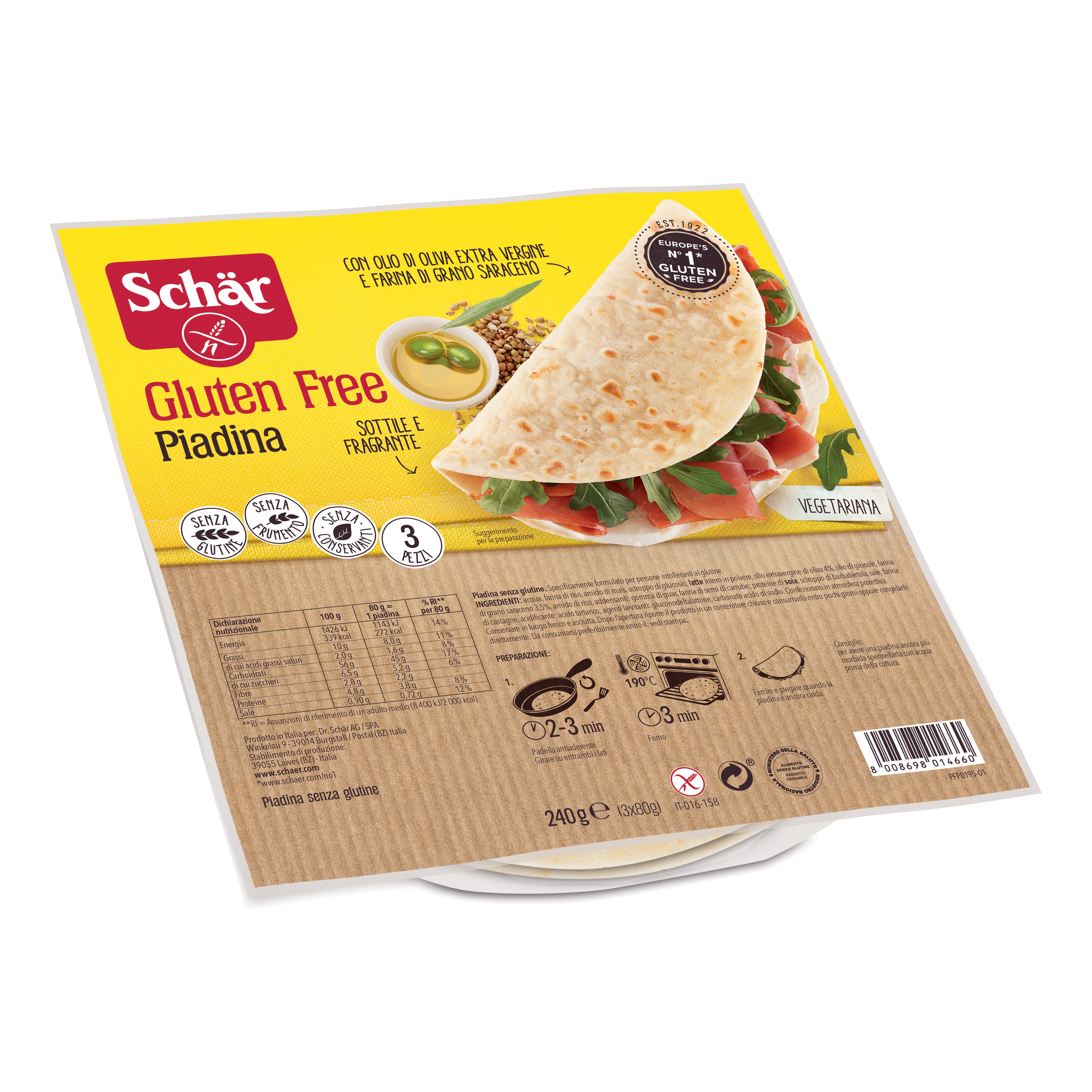 Piadina Prodtto senza glutine, frumento e uova. Ingredienti Acqua, farina di riso, amido di mais, sciroppo di glucosio, latte intero...