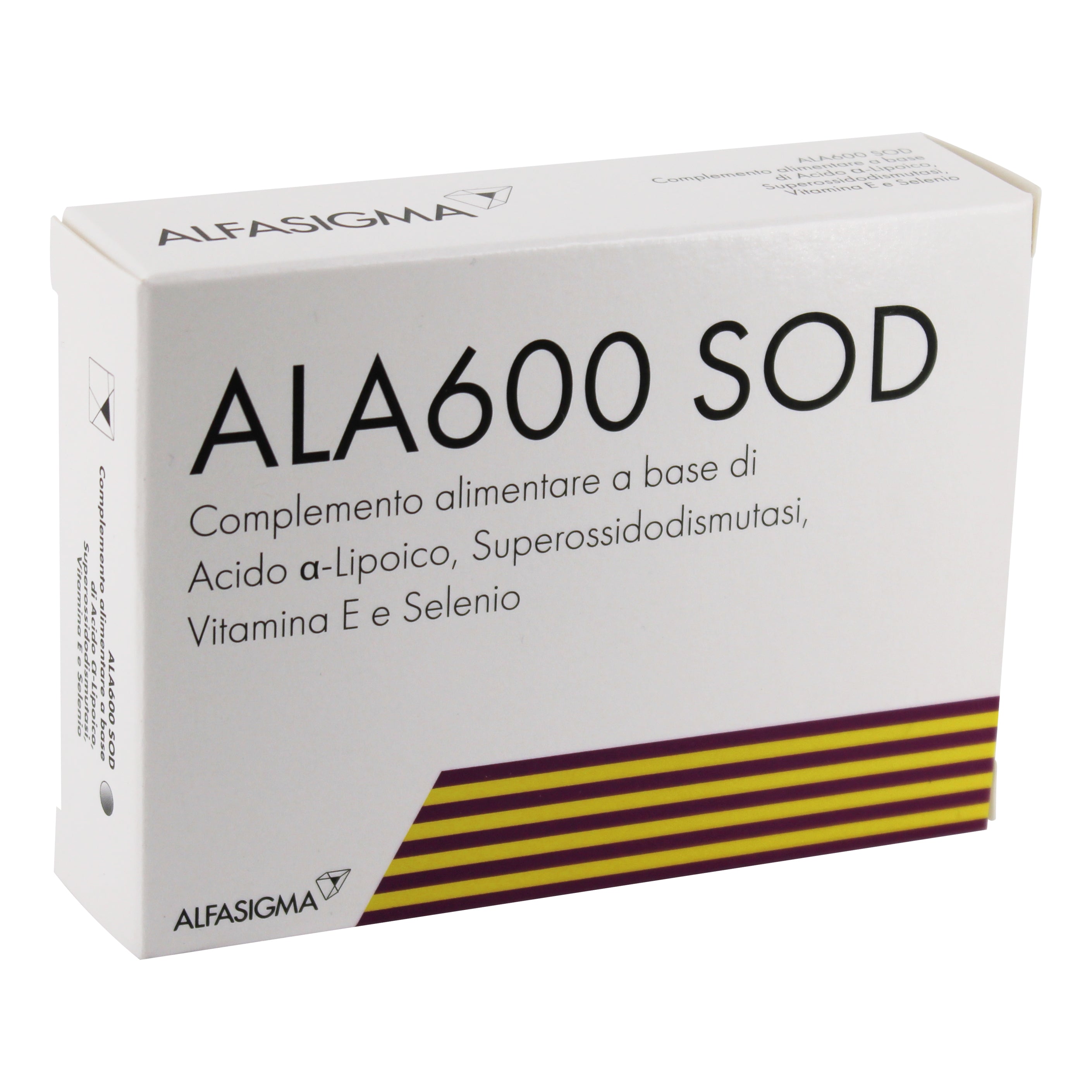 ALA600 SOD Descrizione Complemento alimentare a base di acido alfa-lipoico, superossidodismutasi (SOD), vitamina E e selenio. La composizione di ALA600-SOD...