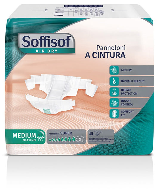 SoffisofAIR DRYPANNOLONI A MUTANDINAMEDIUM 70-110 cmASSORBENZA SUPER (8 gocce) Descrizione Ausilio assorbente di forma anatomica composto da fluff di pura...
