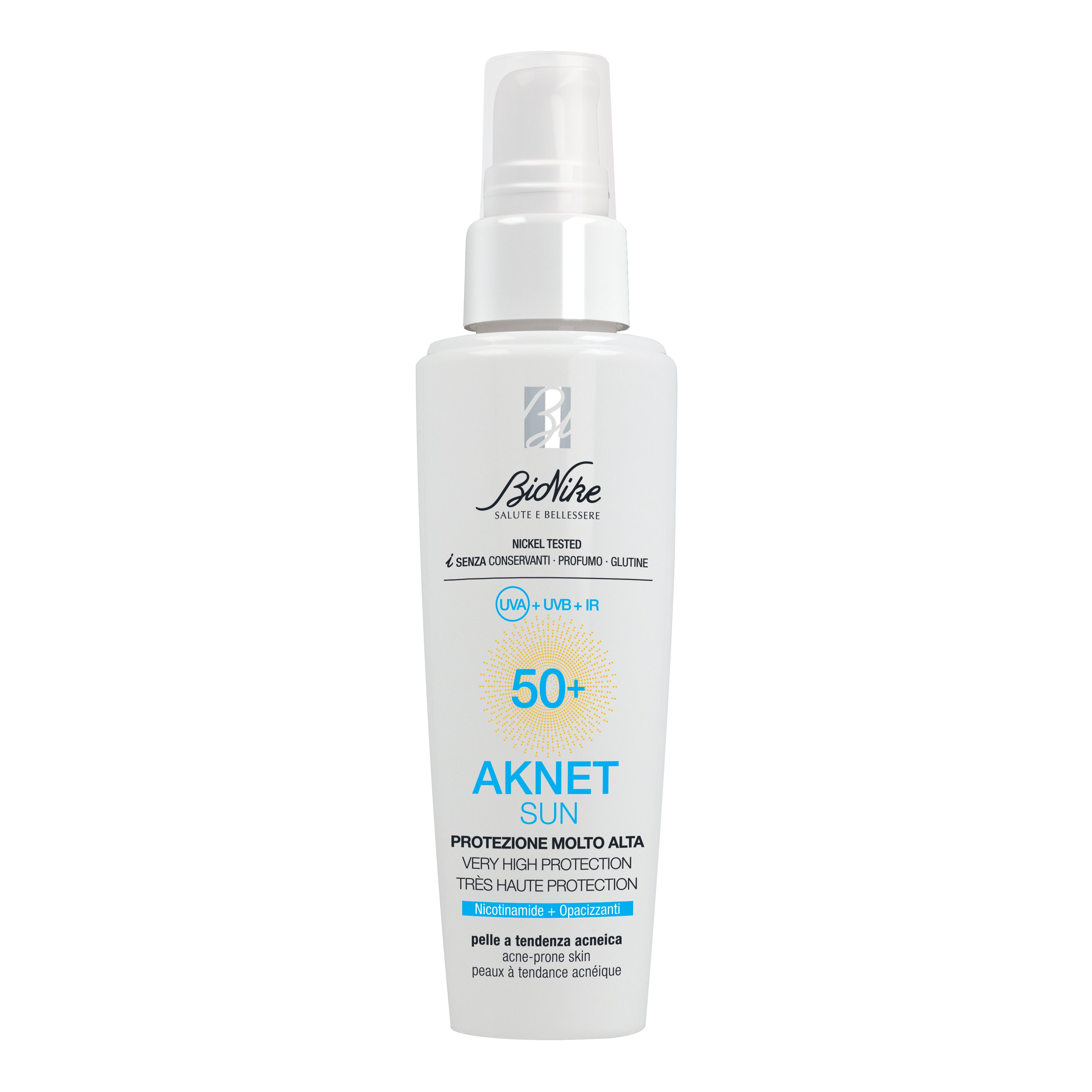Bionike Aknet Sun SPF50+ Fluido per la fotoprotezione specifica della pelle a tendenza acneica. Formulato con la tecnologia Network Expert...