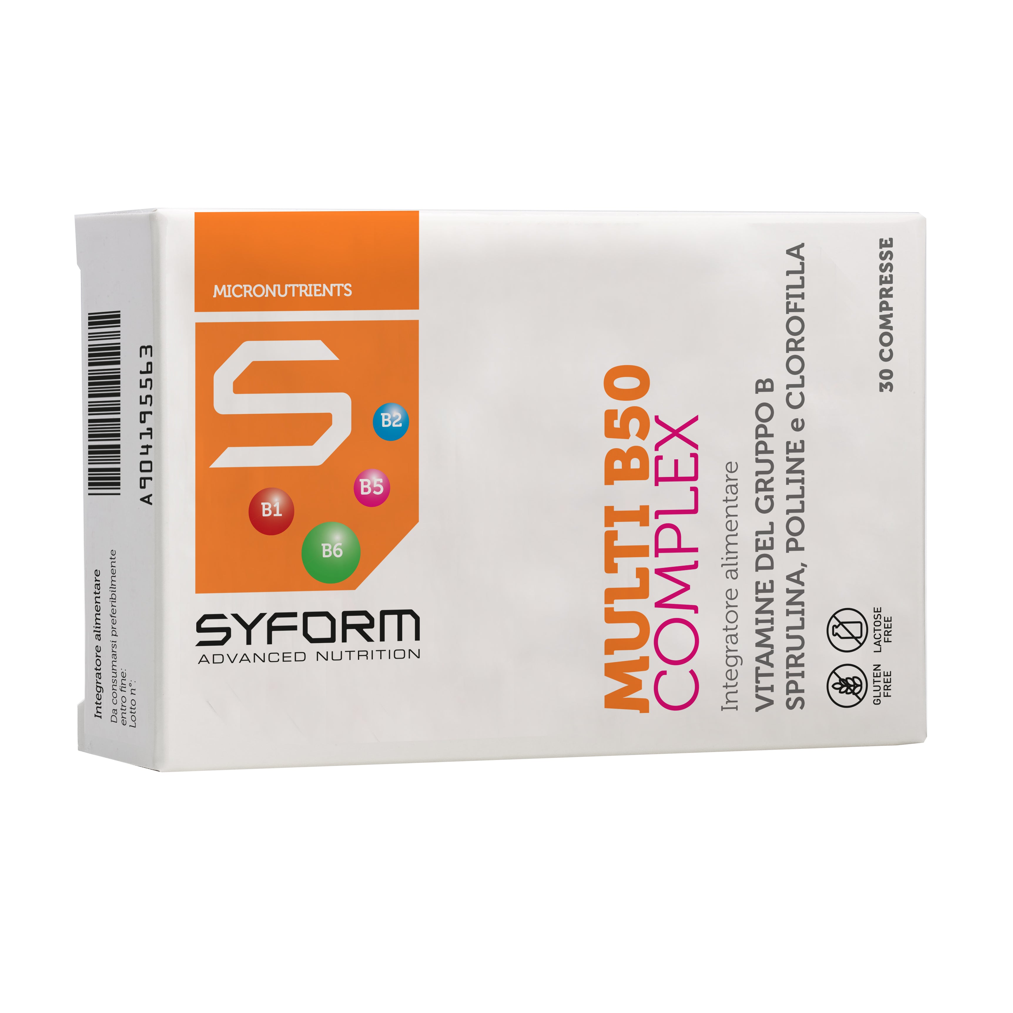 MULTI B50 COMPLEX Descrizione Integratore alimentare a base di vitamine del gruppo B, spirulina, polline e clorofilla. Ingredienti Amido di...