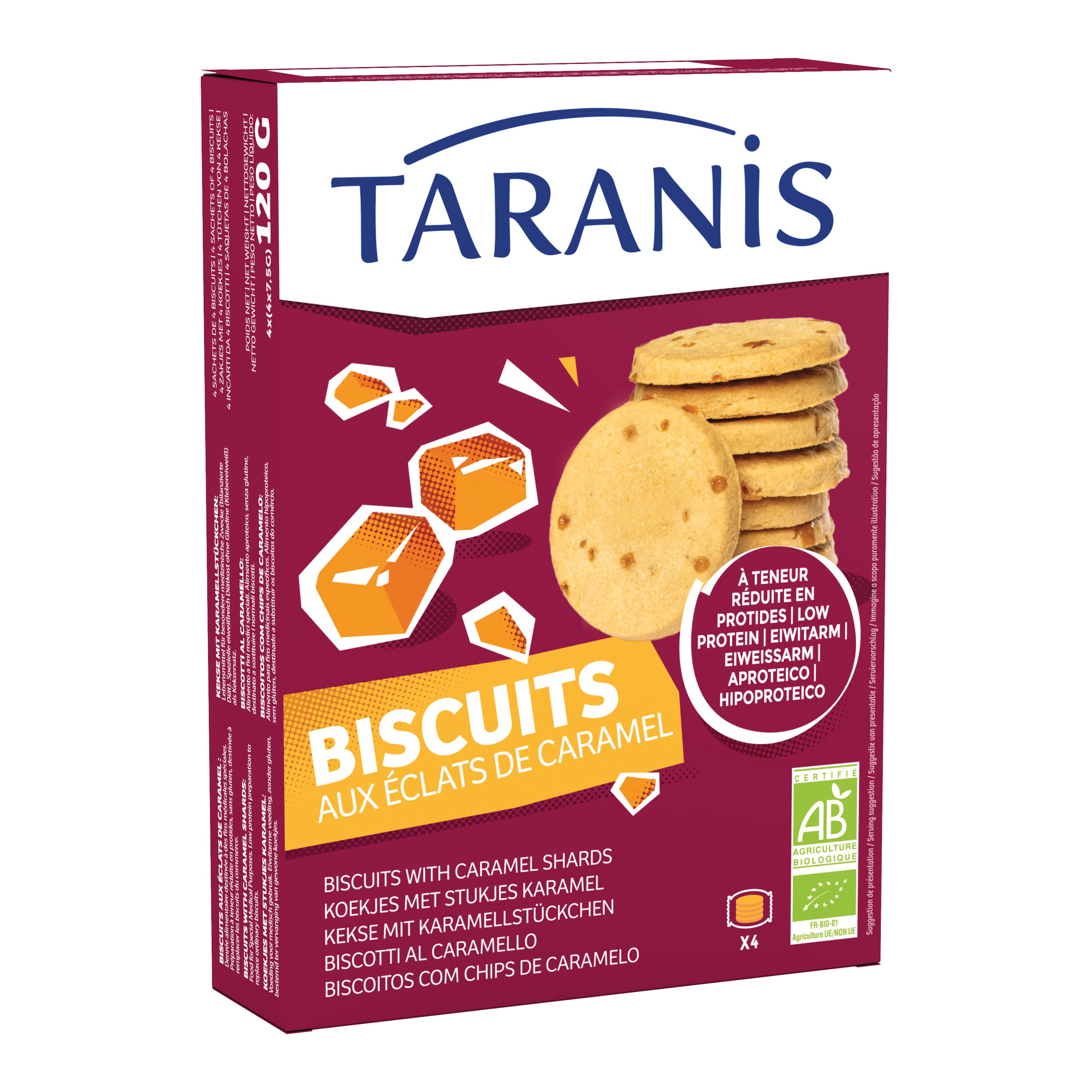 TARANIS Biscotti al caramello Descrizione Biscotti aproteici al caramello. Ingredienti Amido di mais*, olio di palma*, zucchero*, sciroppo di glucosio*,...