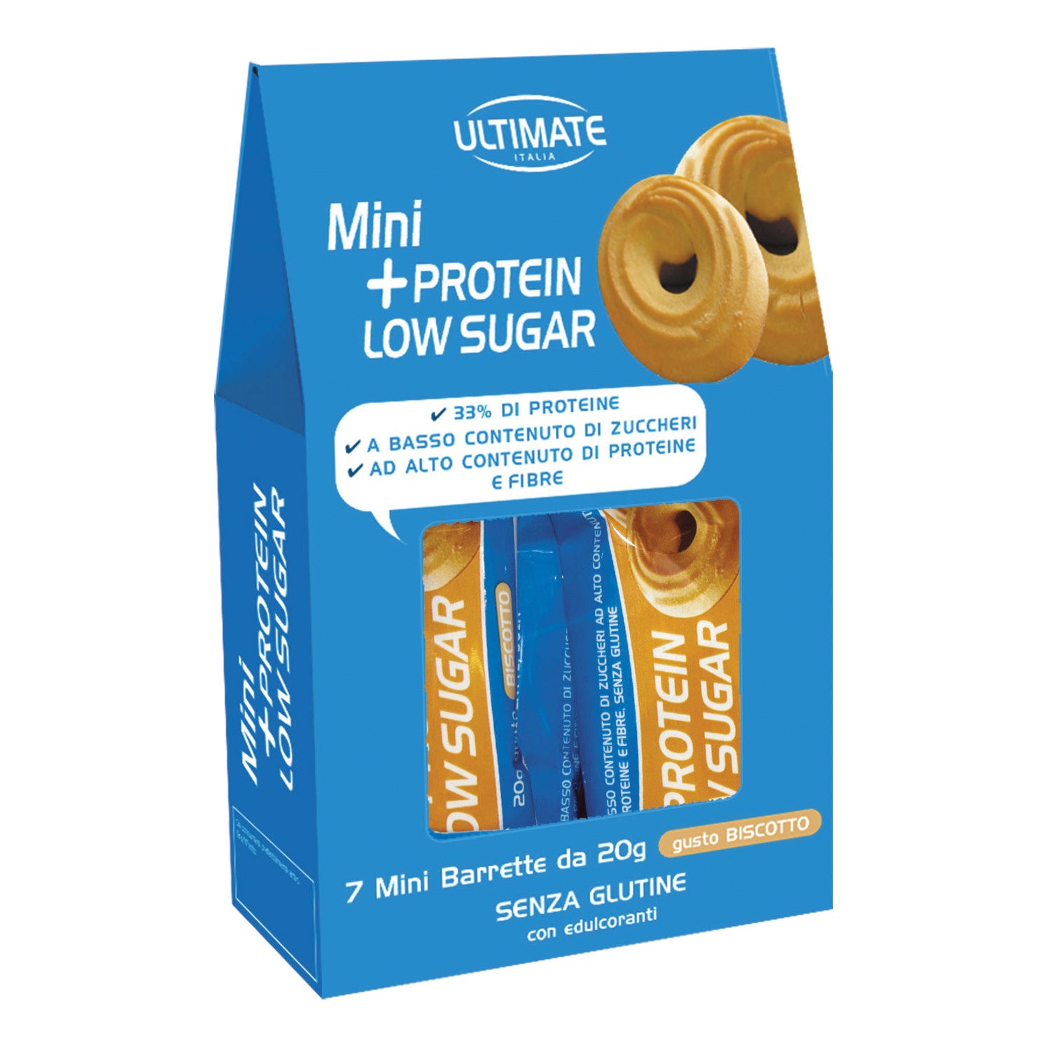 ULTIMATE Mini +PROTEIN LOW SUGAR Descrizione Integratore alimentare di proteine (33%), a basso contenuto di zuccheri e alto contenuto di...
