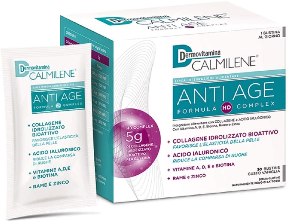 Dermovitamina CALMILENE ANTIAGE Descrizione Integratore alimentare a base di collagene e acido ialuronico, con vitamine A, D, E,biotina, rame e...