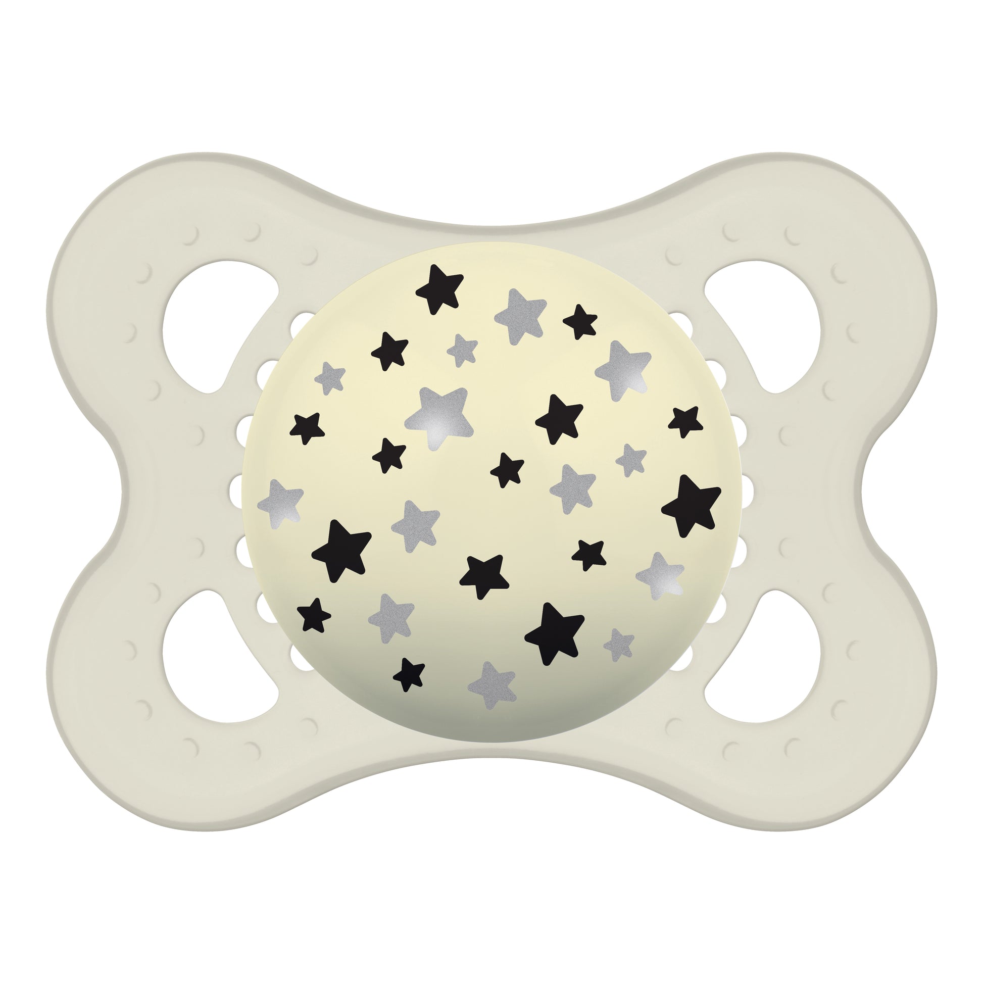 Ciuccio che si illumina al buio, facile da trovare grazie al bottone luminescente.