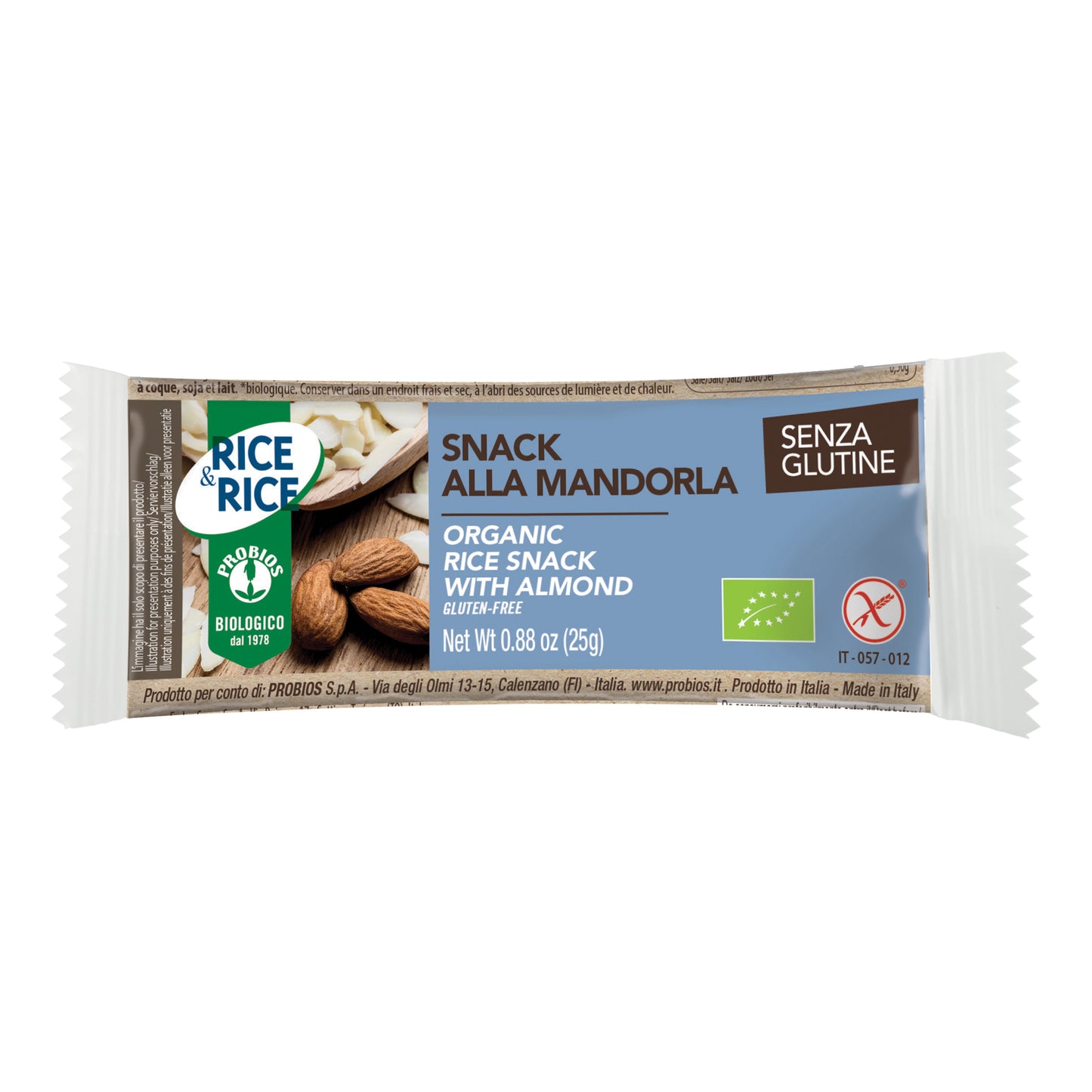 Snack di riso ripieno con crema di mandorla, dolcificato solo con sciroppo di mais.